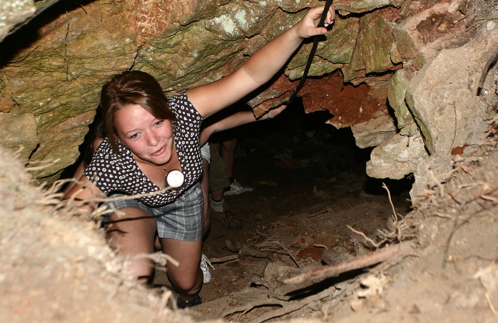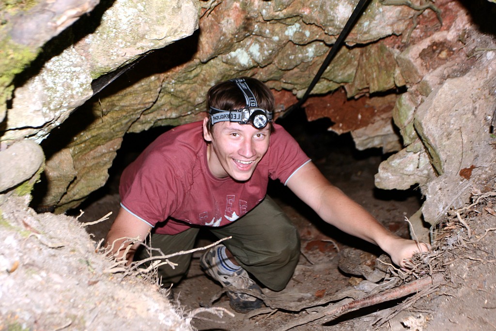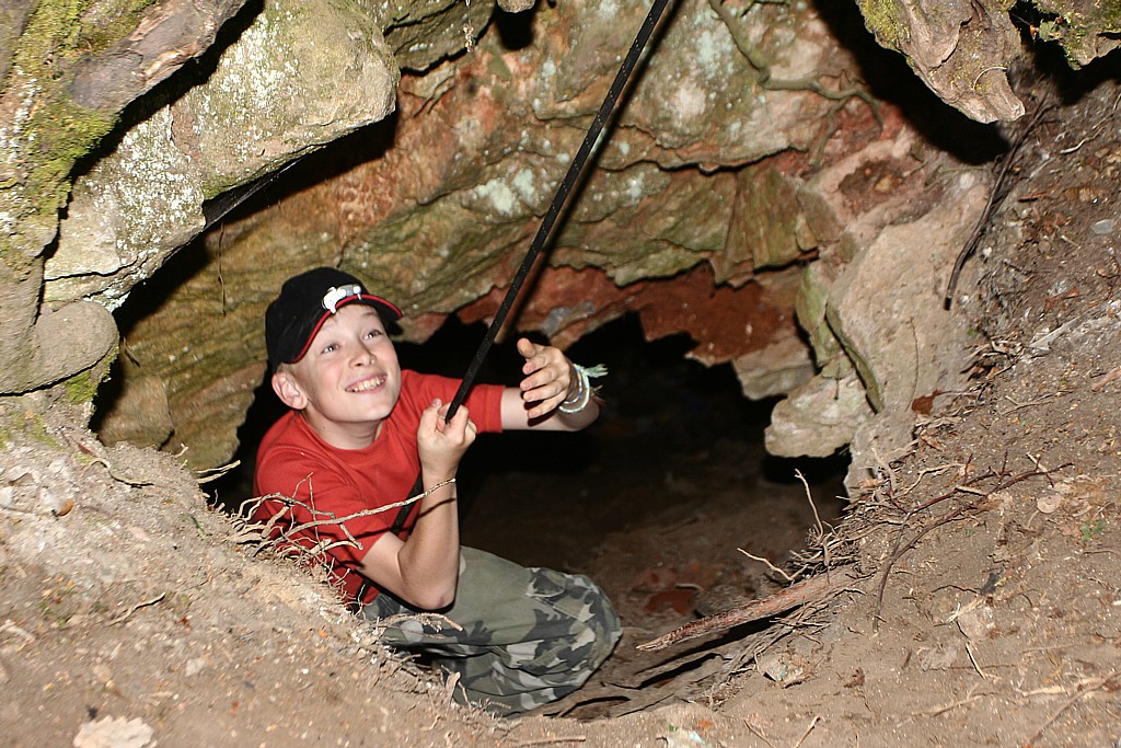 Ládík marně hledá vstup do podzemí v téhle díře