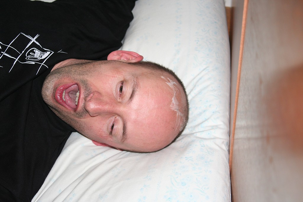 ráno byl kapelník bez hlasu, pohybu a základních refexů celkem lehce namazán zubní pastou (ústa má otevřená ještě z večerního vystoupení)