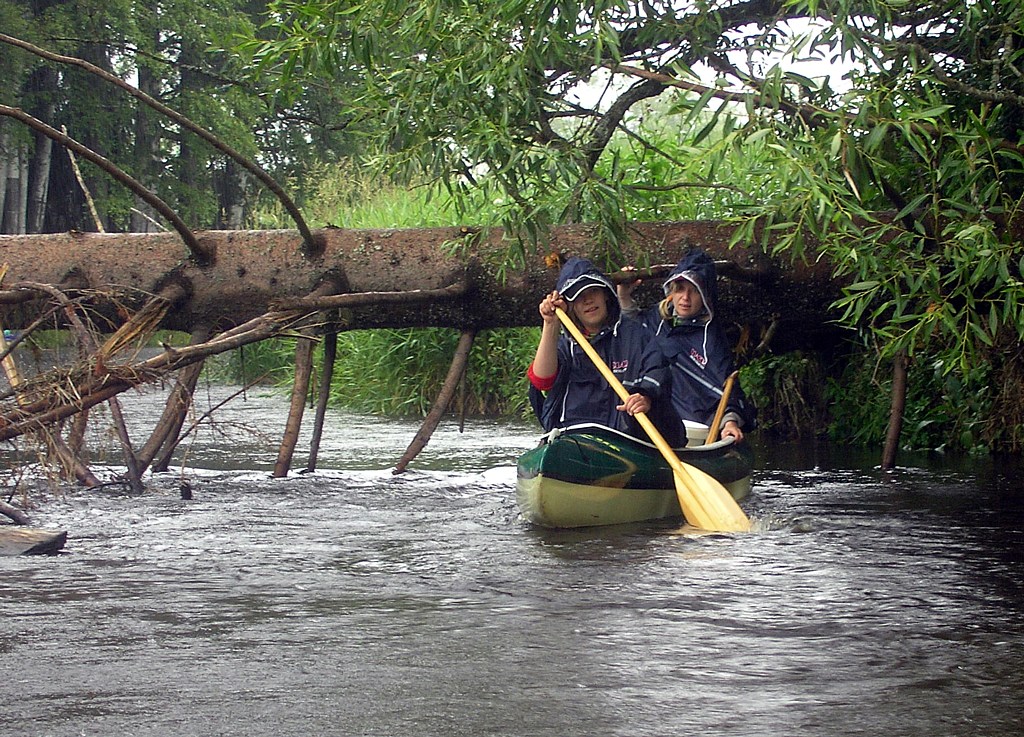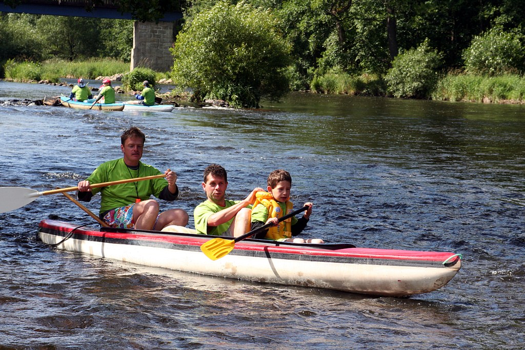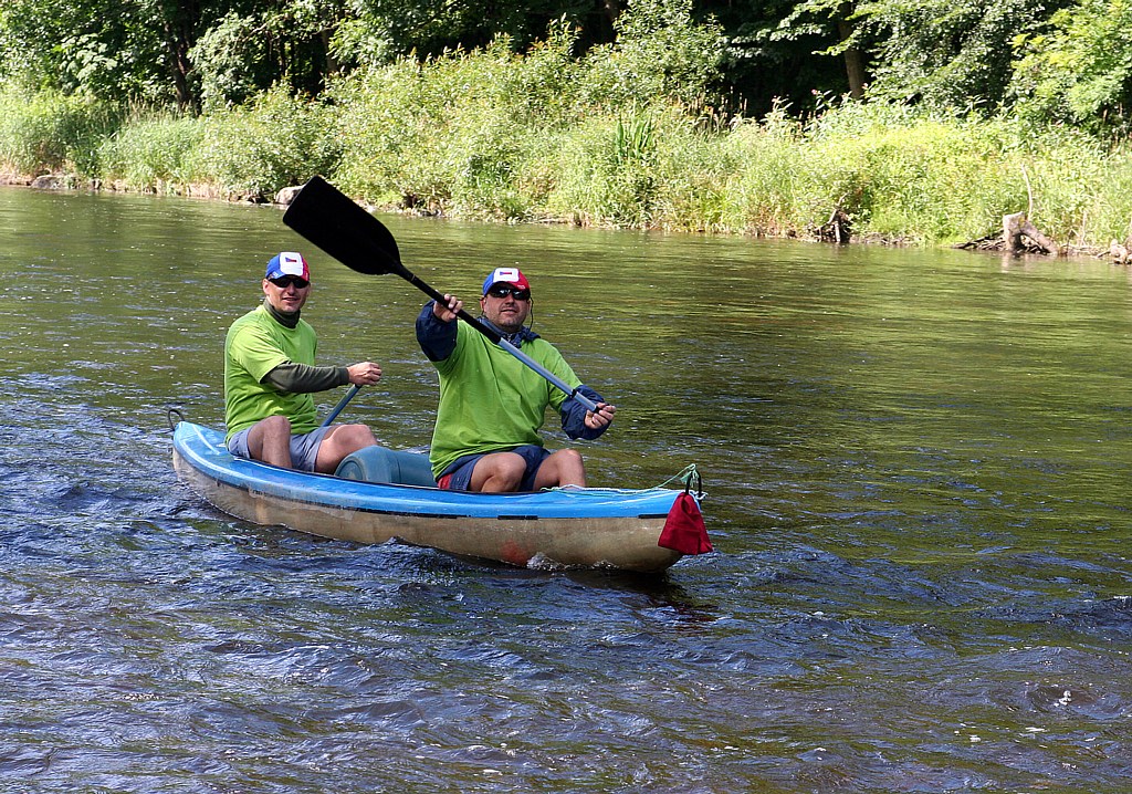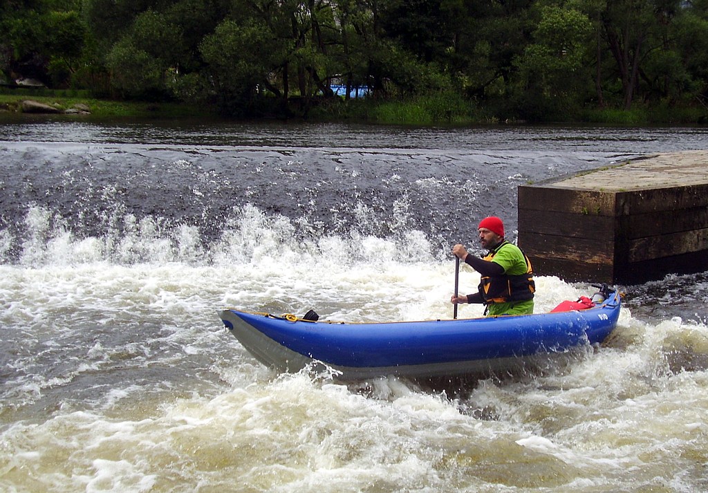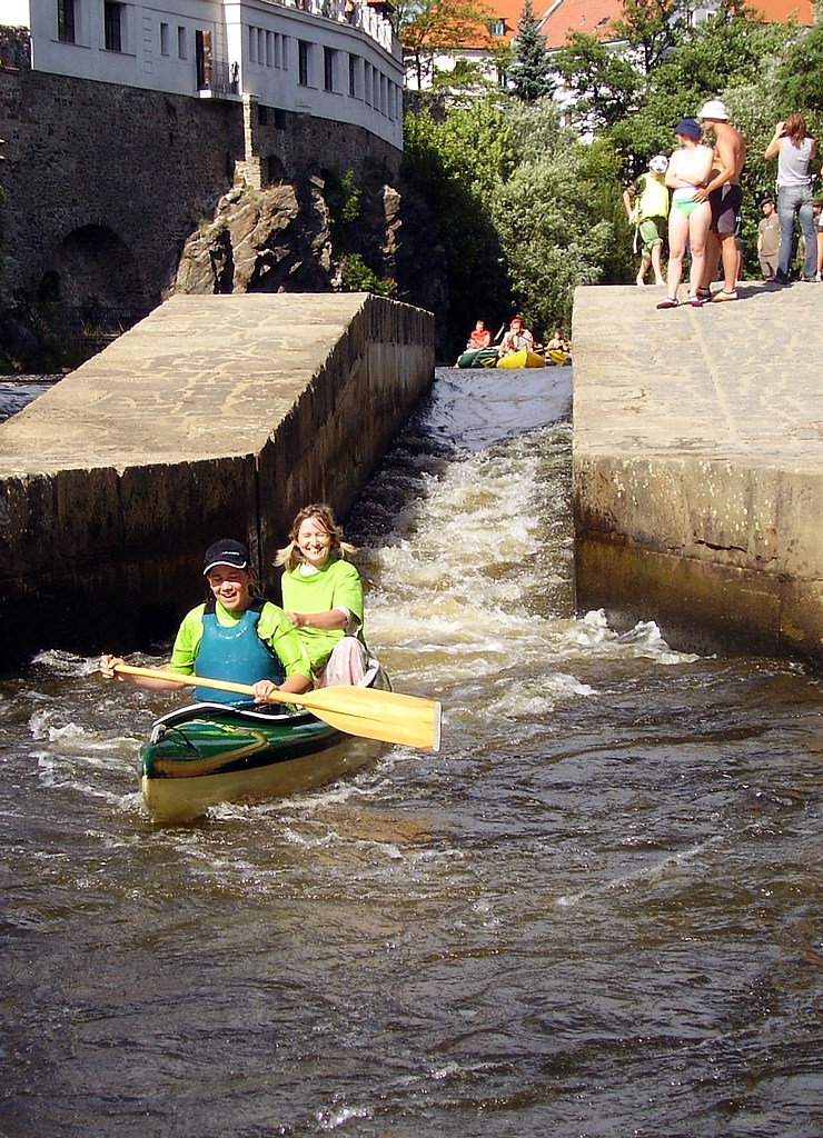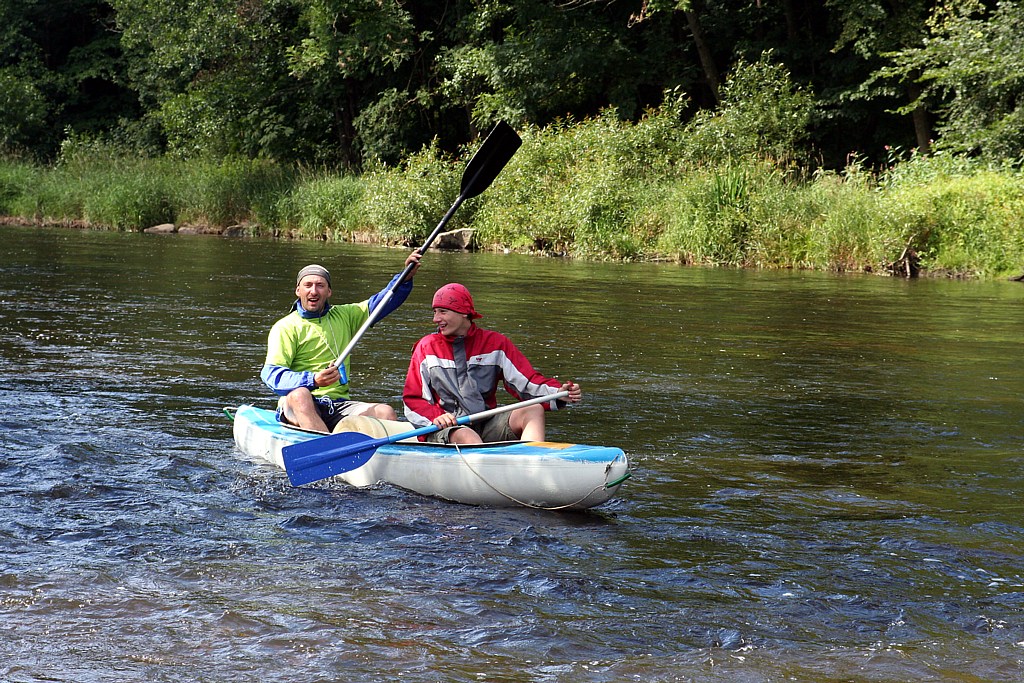 Honza bravurně sjíždí první jez (Koldovi s Jeníkem se to tolik nepodařilo:-)